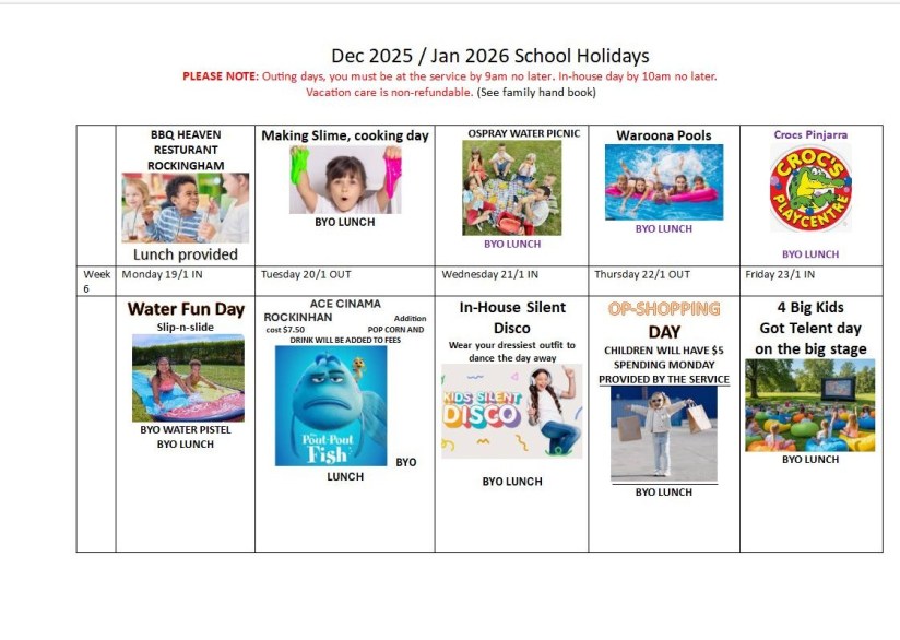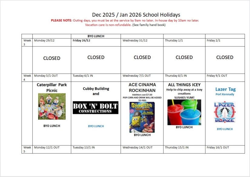 Please understand Vacation Care is Non-refundable and Non-transferable, as outings and events are booked and paid for in advance.